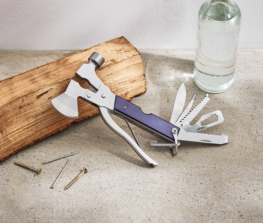 - 11 funkcií: sekerka, kladivko, nôž s hladkým ostrím, kliešte, pilník, pílka na drevo, pílka, krížový skrutkovač, plochý skrutkovač, skrutkový kľúč (6, 7, 8, 10 mm) a otvárač na fľaše