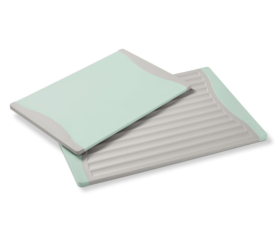Veľká doska má navyše aj jednu stranu s ryhovanou štruktúrou, ktorá môže slúžiť napríklad na zachytávanie tekutín alebo omrviniek. Obidve dosky možno používať obojstranne – a vďaka moderným a sviežim pastelovým farbám skvele poslúžia aj na servírovanie.