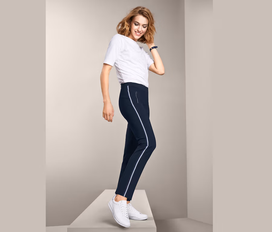 Tieto strečové nohavice dodajú každému outfitu športovo-módny vzhľad, a to nielen vďaka ich výrazným lampasovým prúžkom z lemovky na bočnom šve. Tieto dámske nohavice s dĺžkou približne po členky perfektne sedia, pričom však neobmedzujú v pohybe.