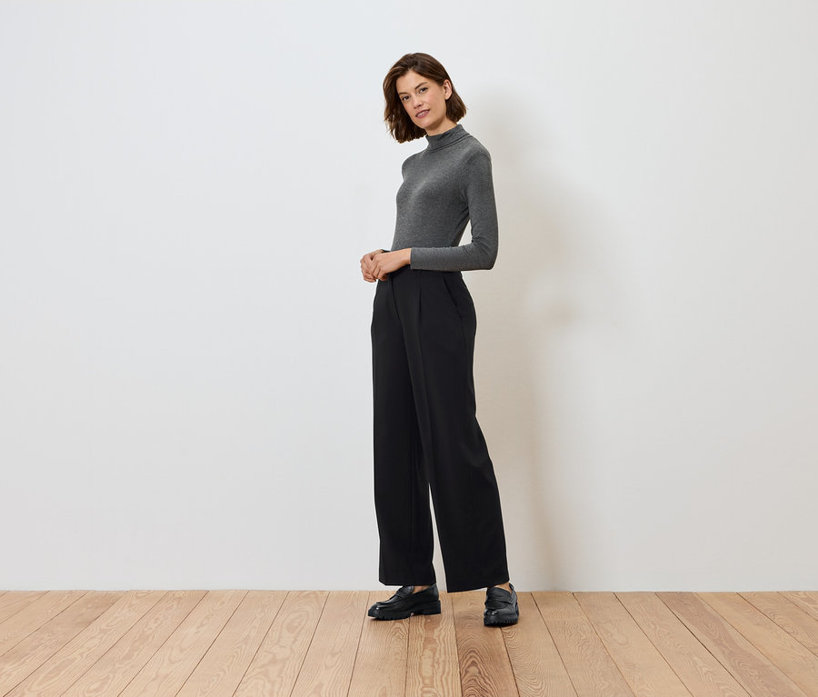 - Elastický pás s pútkami na opasok, so zipsom, s háčikmi a so skrytým gombíkom