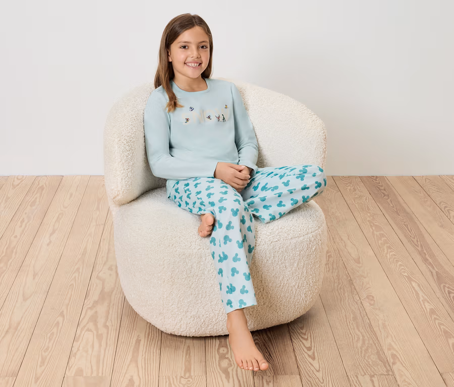 - Vrchný diel svetlomodrý s krémovým nápisom SNOW a pestrofarebnými postavičkami Disney