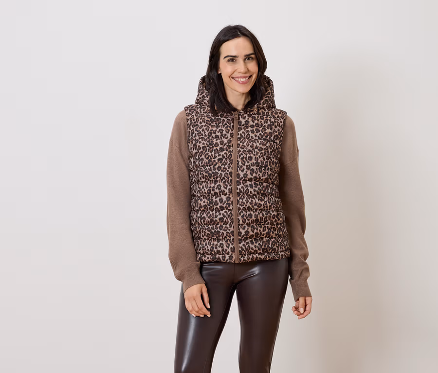 Prešívaná vesta s kapucňou, béžová s hnedo-čiernou celoplošnou leoparďou potlačou