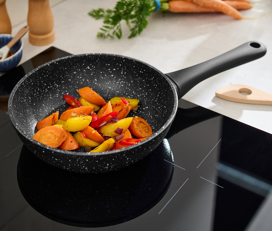 - Kvalitná nepriľnavá vrstva GREBLON® Q-LINE CK 3000 bez PFAS – ideálna na smaženie s malým množstvom tuku, zabraňuje pripaľovaniu a prichytávaniu pokrmov, ľahko sa čistí