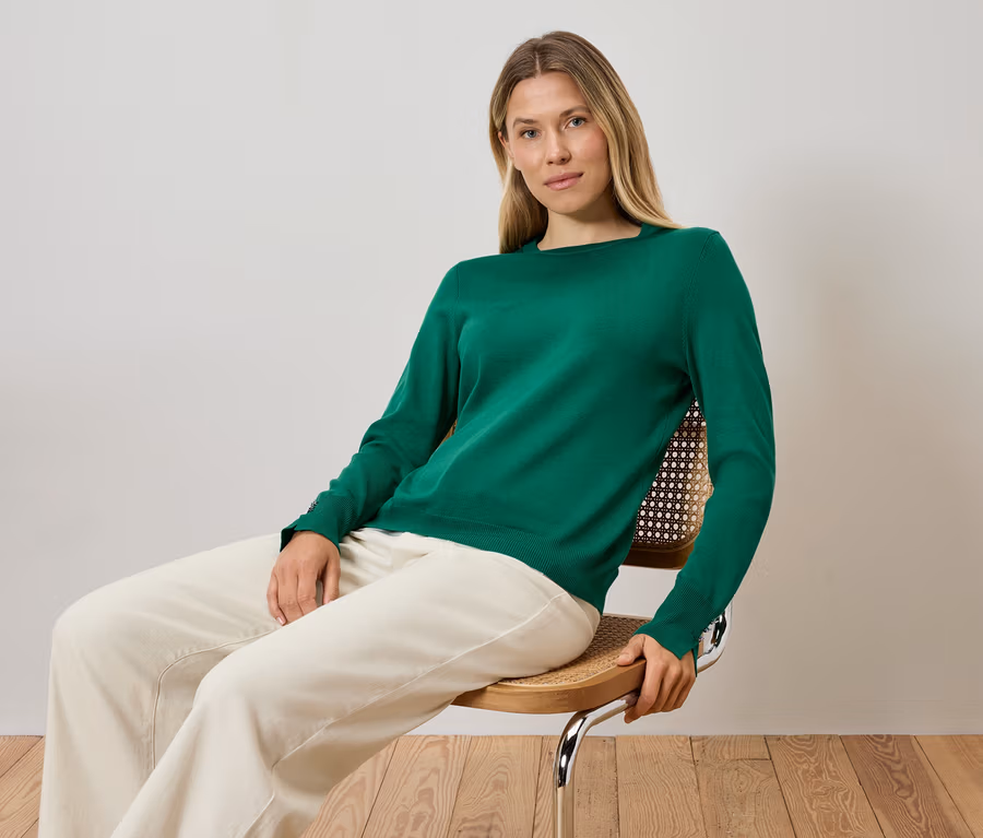 - Elastické rebrované lemy na výstrihu, koncoch rukávov a spodnom okraji