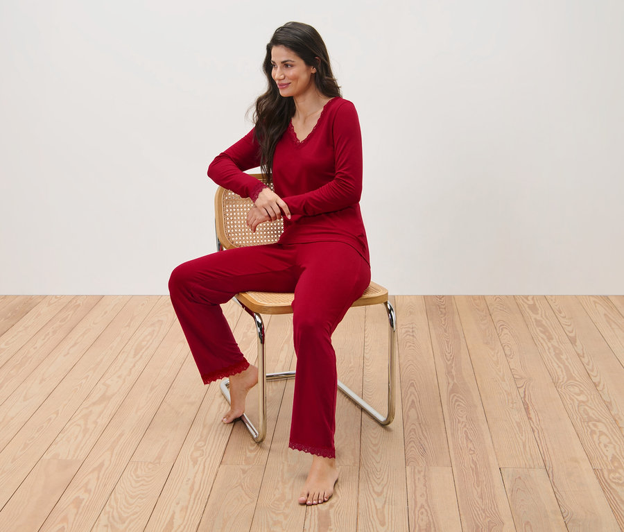 - Výstrih do V, rukávy a konce nohavíc zakončené jemným čipkovaným lemom