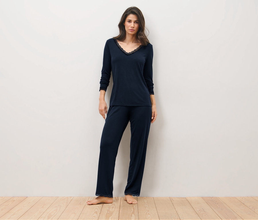 Pyžamová súprava s čipkovaným lemom, tmavomodrá