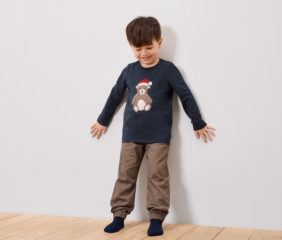 - 1x modré s viacfarebnou potlačou nákladiaku a bielymi vianočnými vločkami, 1x tmavomodré s bielobéžovou potlačou medveďa