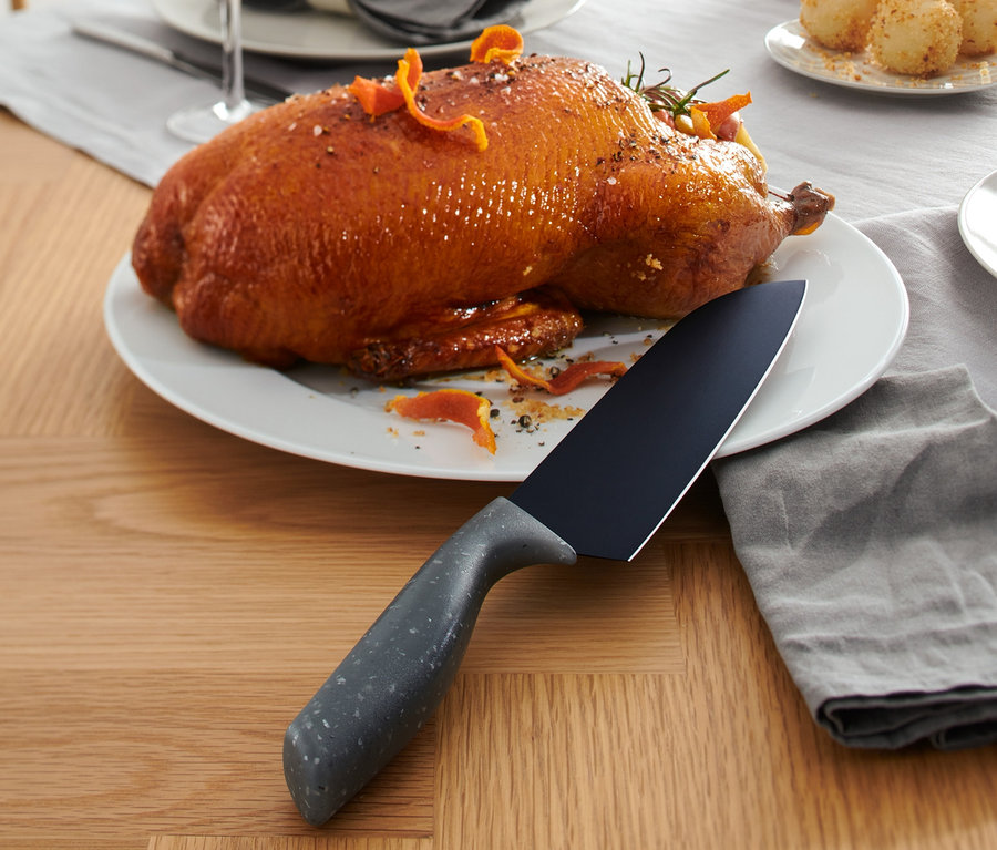 • Veľká čepeľ s nepriľnavou povrchovou úpravou a hladkým výbrusom – ideálna na krájanie a porciovanie mäsa, rýb a zeleniny