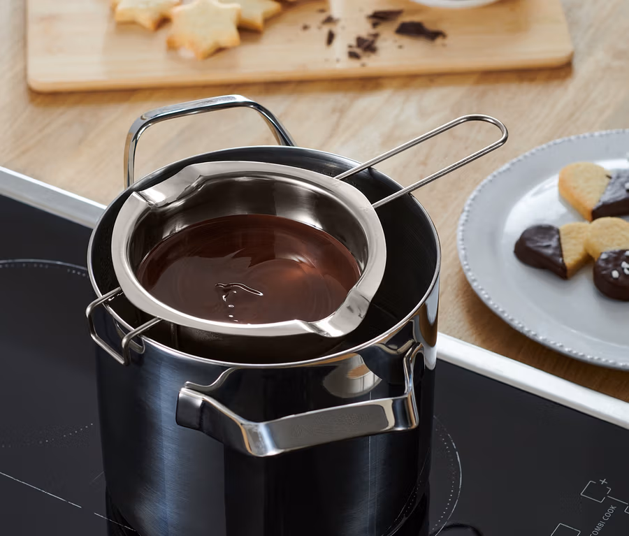 - Na rozpúšťanie čokolády, masla alebo iných potravín, ktoré vykazujú rovnakú konzistenciu a teplotu