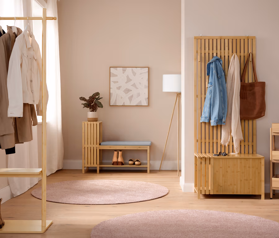 • Úložný priestor z bambusových lamiel, regál na topánky a sedadlo v bambusovom vzhľade