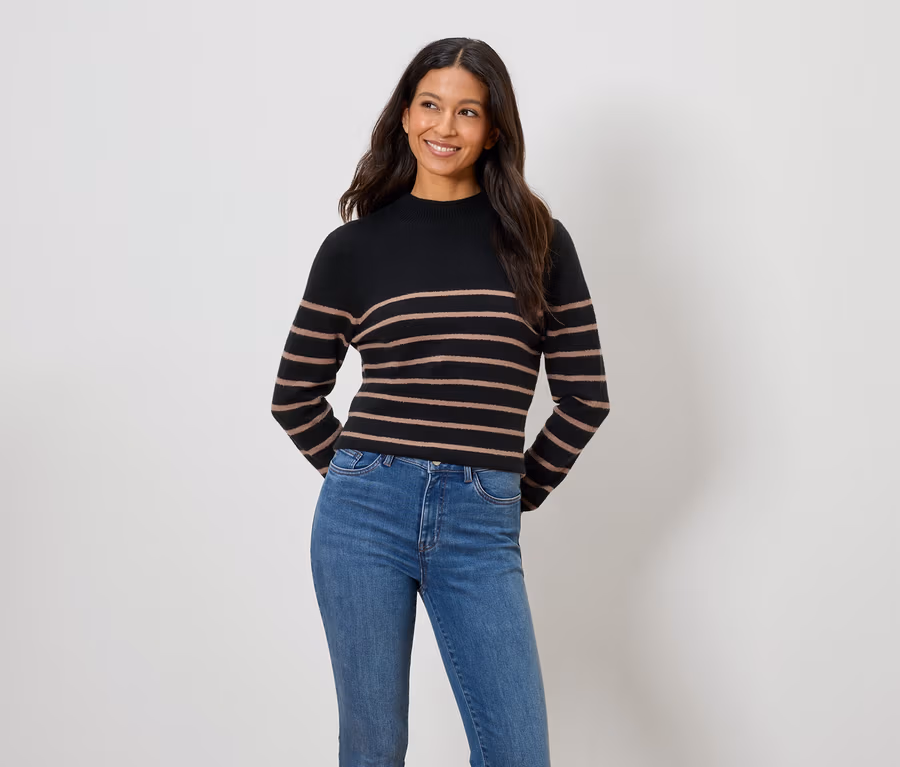 Pletený pulóver so stojačikom, čierny so svetlohnedými pásikmi