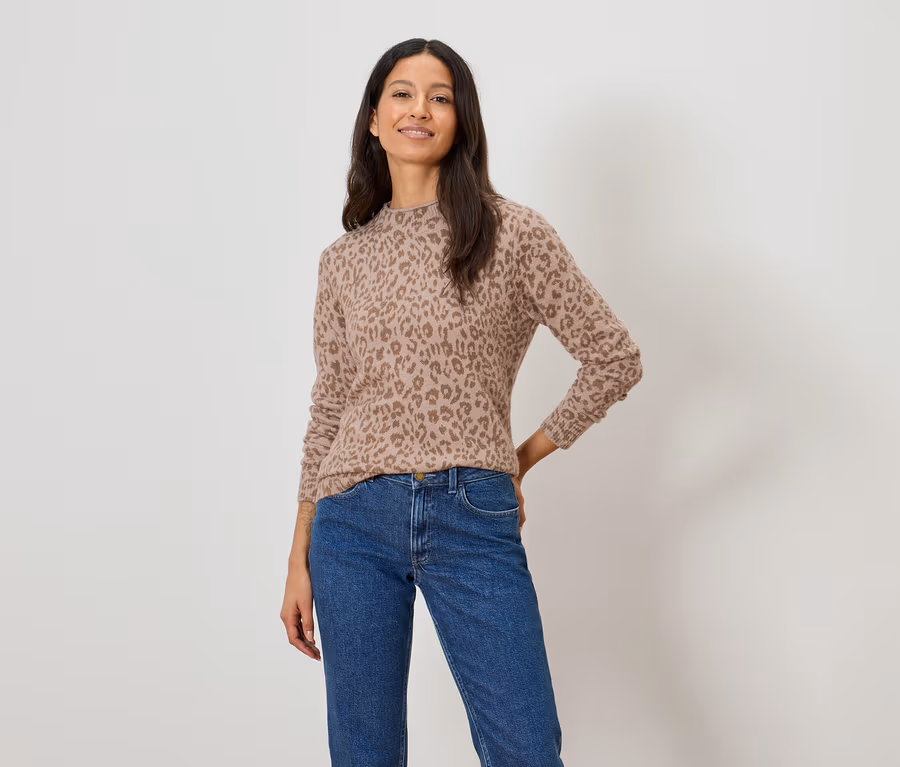 Pletený sveter so stojačikom, béžový melír so svetlohnedou celoplošnou leoparďou potlačou