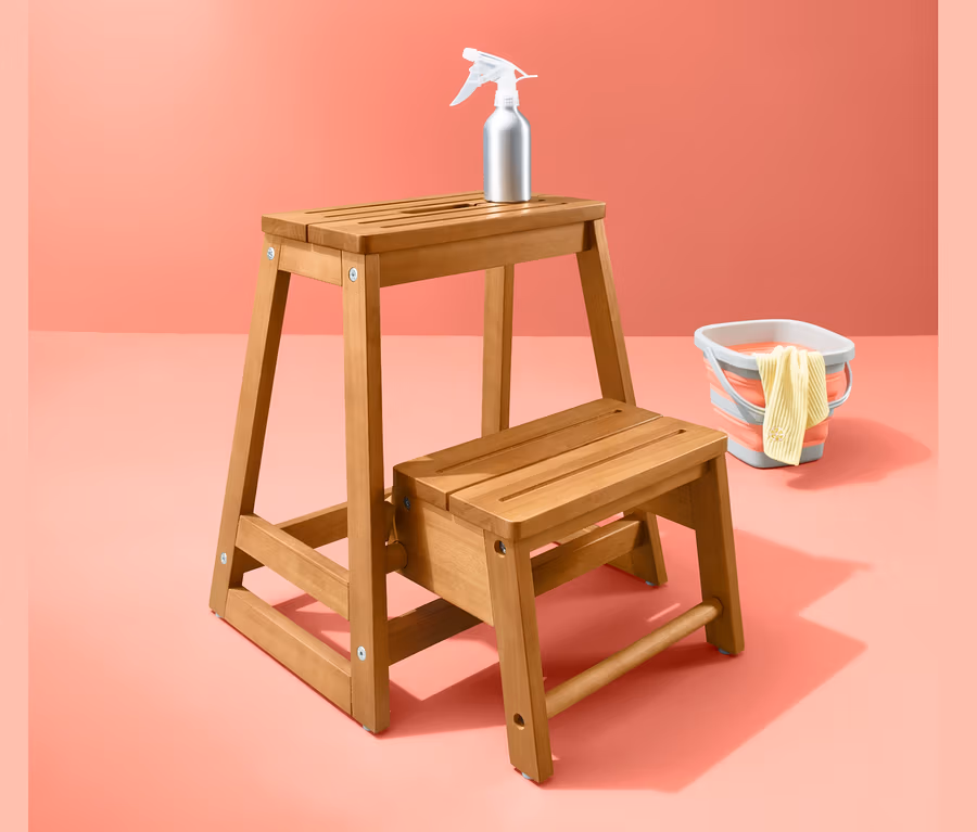 Tento sklopný schodík z eukalyptového dreva s certifikátom FSC® a svetlým lakovaním je veľmi užitočný na to, aby ste sa bezpečne a bez nehody dostali na ťažko prístupné miesta v domácnosti – či už ide o vysoký regál, najvrchnejšiu priehradku v skrini, alebo žiarovku. Sklopný schodík s výklopnou podnožkou, ktorá slúži ako medzistupienok alebo odkladacia plocha, má na najvyššom stupienku otvor ako úchyt, a tak s ním možno pohodlne manipulovať a prenášať ho. Odolný a nadčasový nábytok možno použiť aj ako miesto na sedenie.