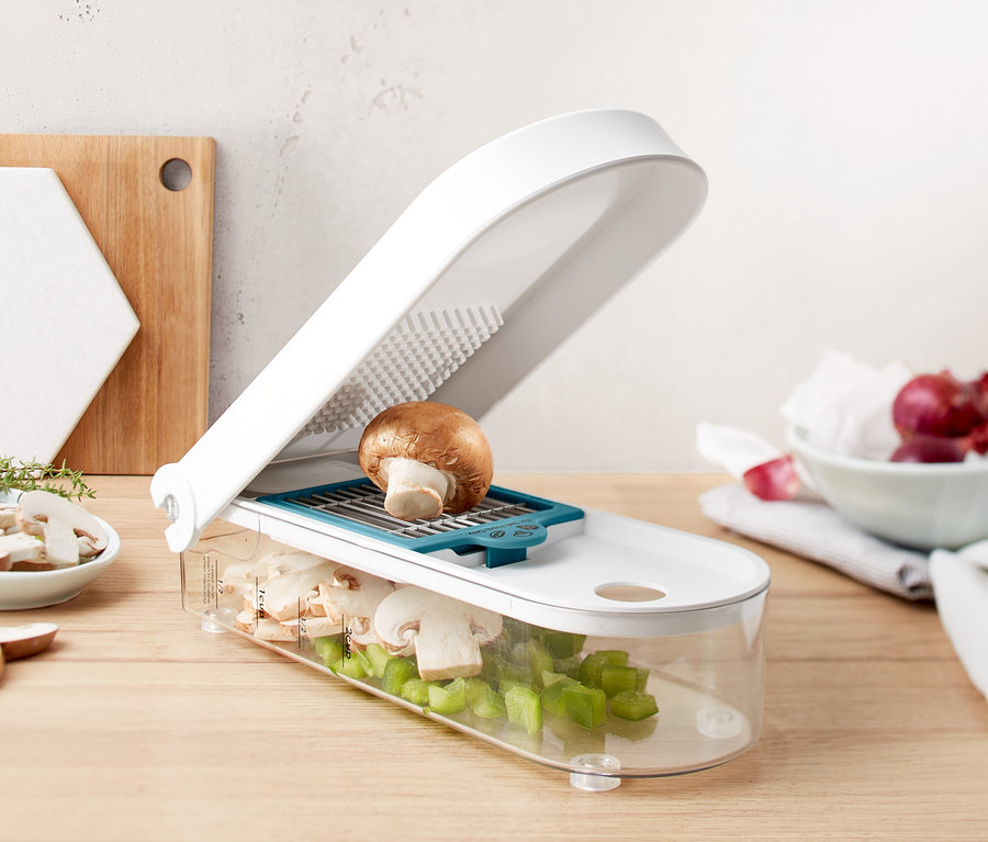 Bezpečné krájanie zeleniny, jednoducho vďaka pákovému efektu: Tento krájač na ovocie a zeleninu pokrája čerstvé prísady so svojimi tromi vymeniteľnými nadstavcami a obzvlášť ostrými čepeľami na plátky a malé alebo veľké kocky – a to bez toho, aby ste čo i len raz vystavili prsty nebezpečenstvu. Krájané potraviny sa pritom pretláčajú priamo do záchytnej nádoby. Nádoba má stupnicu v ml a šálkach, súčasťou balenia je aj vhodná pomôcka na čistenie.