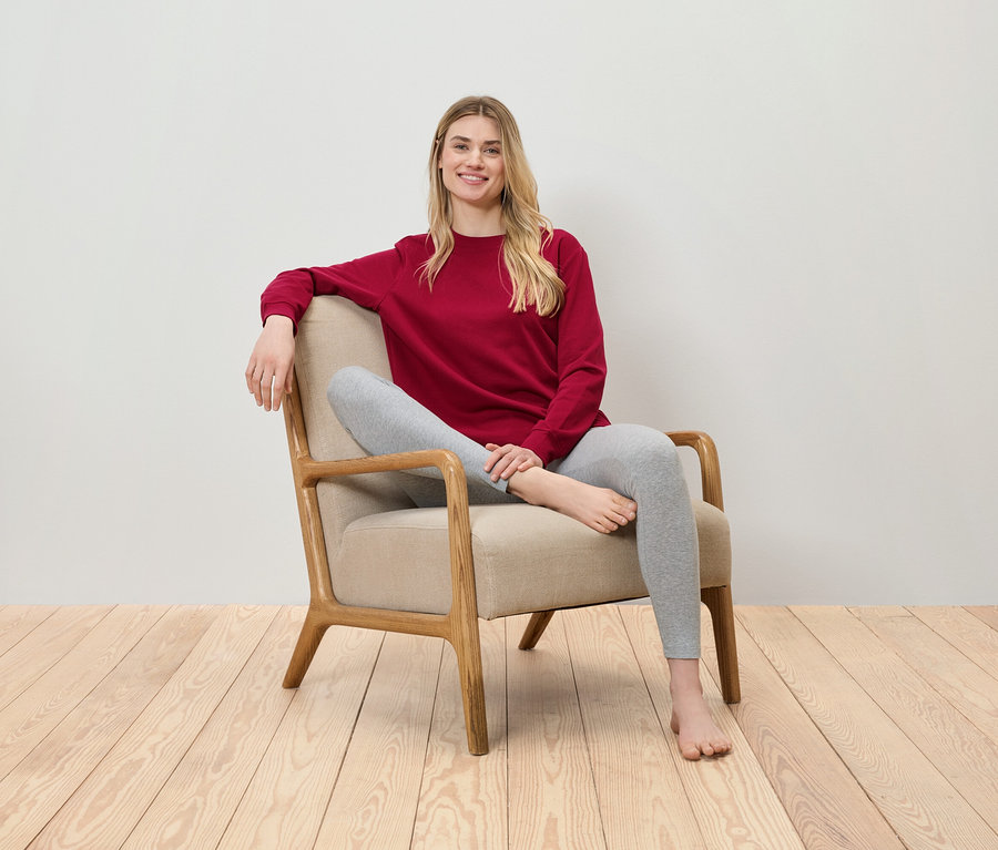 - Tmavočervený vrchný diel. Legínsy sivé melírované