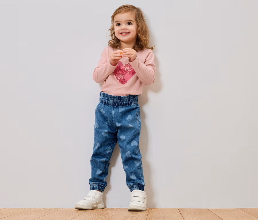 - Modrý denim s celoplošnou potlačou s motívom srdiečok