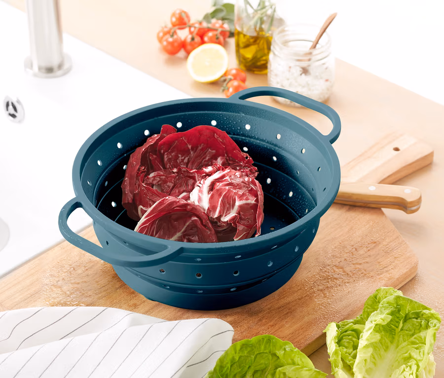 Praktické, keď ho potrebujete – prakticky neviditeľné, keď ho netreba. Toto kuchynské sitko zo silikónu dokáže všetko, čo možno očakávať od sitka: hodí sa na umývanie a odkvapkávanie čerstvých potravín, ako sú ovocie, zelenina alebo šalát, a na zlievanie cestovín či zemiakov – vďaka nožičkám pritom umožňuje optimálne odtekanie a dva úchyty zaisťujú bezpečné uchopenie. Dokáže však ešte niečo viac. Keď ho práve nepoužívate, možno ho zložiť naplocho a obzvlášť priestorovo úsporne uschovať.