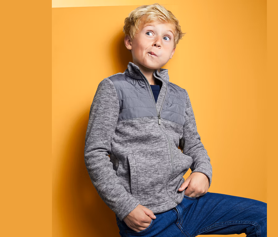 Športový vzhľad a hrejivý flís pre aktívne deti: Táto hybridná flísová bunda so stojačikom je kombináciou príjemne teplej flísovej látky a prešívaného všitého dielu. Má výnimočne štýlový vzhľad a protižmolková úprava zabraňuje plstnateniu vlákien na bunde.