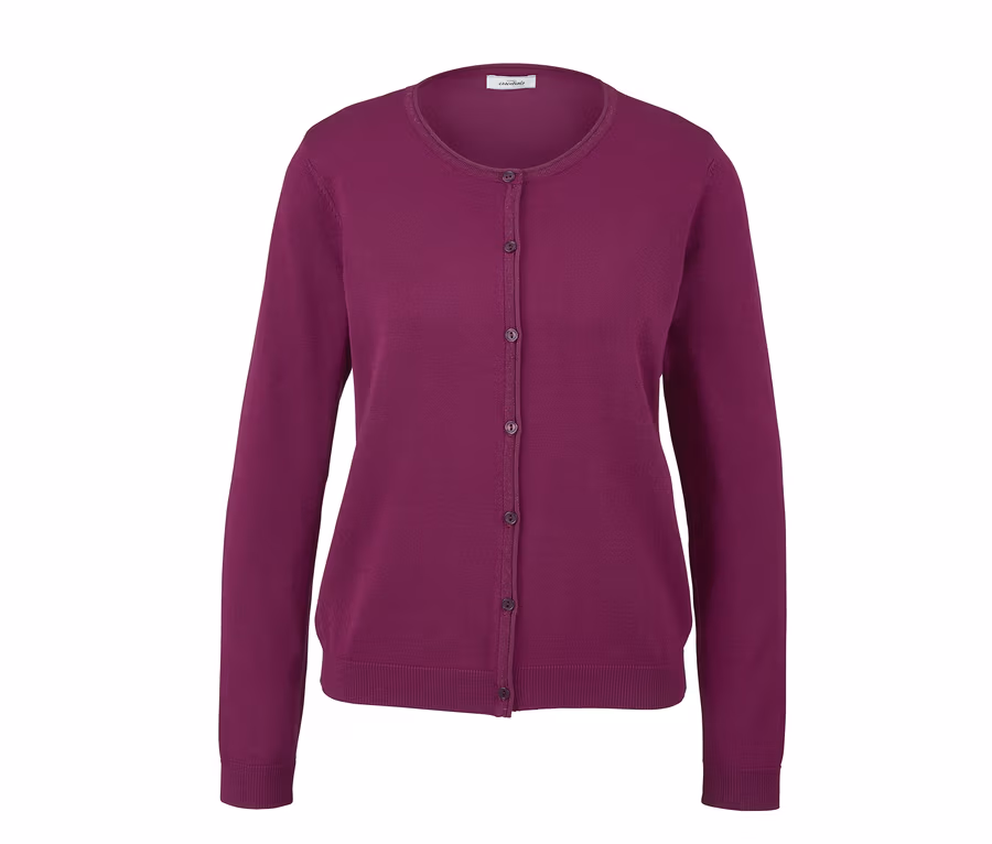 V žiadnom prípade sa nemusí nosiť len zapnutý: tento sveter z jemnej pleteniny Vás nadchne trendovou vínovou farbou a lesklou striebornou priadzou, ktorou je pretkaný rolovaný lem na výstrihu a gombíkovej lége. Preto je kardigán nielen pastvou pre oči – ale vrchný diel pre dámy je vďaka vysokému podielu viskózy aj výnimočne mäkký na dotyk. Nezabudli sme ani na pohodlie pri nosení: na koncoch rukávov a spodnom okraji sa nachádzajú pohodlné lemy, ktoré sa nezarezávajú. A aby všetko dobre držalo tvar, do látky je zapracovaný elastan. Ľahký pletený svetrík, ktorý sa ako módny spoločník hodí ku každému outfitu.