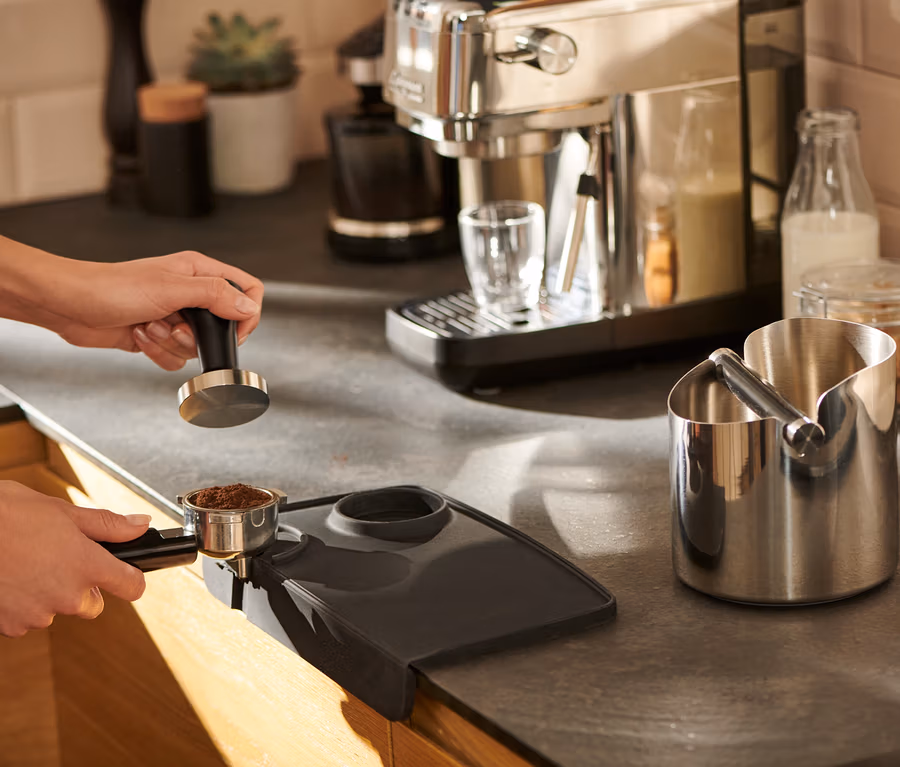 Tampovanie s tým správnym tlakom je nevyhnutnou súčasťou prípravy obzvlášť lahodného espressa. Táto praktická tampovacia podložka z potravinárskeho silikónu chráni nielen páku, ale aj pracovnú plochu. Má okrúhle výrezy na tamper a páku. Vďaka vysokému okraju zostáva prebytočná mletá káva na podložke a dá sa veľmi jednoducho a čisto odstrániť. Tampovacia podložka sa dá ľahko vyčistiť v umývačke riadu.